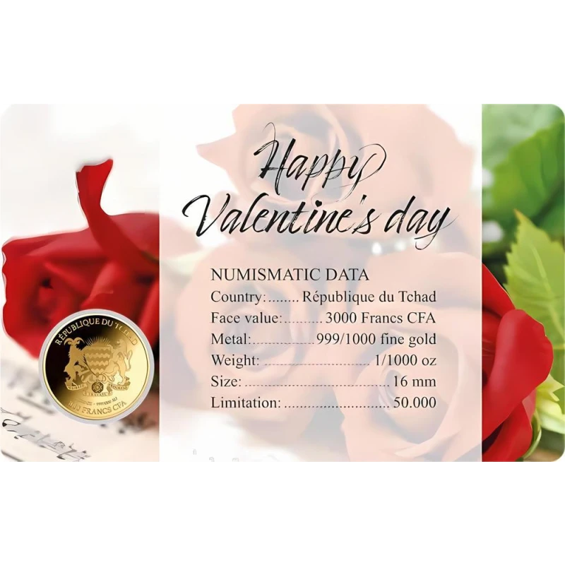 Chad's gold coin "Valentine's Day" (proof), 0.031 g. pure gold (0.999 proof)