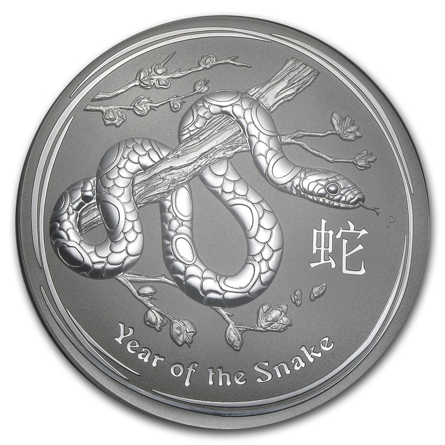De 2013 Jaar van de Slang munt behoort tot de Lunar II serie van The Perth Mint. De munt is geslagen uit 1 kilogram 0,999 fijn zilver, heeft een diameter van 100,6 mm en wordt uitgegeven als wettig betaalmiddel in Australië. Lunar II begon in 2008 met het Jaar van de Rat en zet de traditie van de oorspronkelijke Lunar serie voort. Elke uitgave vertegenwoordigt een van de twaalf dieren van de Chinese dierenriem, gebaseerd op een lunisolair kalendersysteem dat maanmaanden combineert met aanpassingen door de zon. Het bredere Chinese kalendersysteem werkt met cycli van zestig jaar die worden gevormd door de interactie van twaalf dieren van de dierenriem en vijf elementaire krachten in yin- en yang-vormen. De Slang is het zesde teken van de Chinese dierenriem en symboliseert wijsheid, intuïtie, intelligentie en innerlijke kracht. Op de voorkant staat het portret van koningin Elizabeth II samen met het jaar van uitgifte, het gewicht en het land van herkomst. De achterkant toont het ontwerp van het Jaar van de Slang in de kenmerkende artistieke stijl van de Lunar II serie. Met zijn substantiële zilvergehalte en sterke serieherkenning is de kilo Lunar II munt zowel een solide investeringmunt als een gewild verzamelobject.