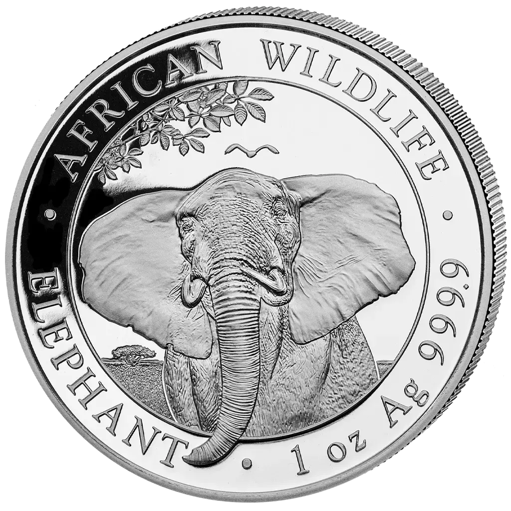 Deze zilveren investeringmunt, geslagen in 2021 als onderdeel van de African Wildlife serie, is gemaakt van 1 ounce 0,9999 puur zilver en heeft als afbeelding de Somalische olifant. De serie staat bekend om zijn jaarlijks wisselende ontwerpen, waardoor de belangstelling onder verzamelaars en beleggers groot blijft. De achterkant toont een opvallend portret van een volwassen olifant tegen de Afrikaanse savanne. Zijn slurf reikt verder dan het kader van het ontwerp, waardoor een dynamisch gevoel van diepte en beweging ontstaat. De compositie benadrukt zowel de kracht van het dier als de artistieke innovatie van de serie.