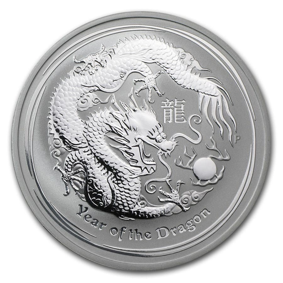 De zilveren munt Australia Lunar II Year of the Dragon 2012 bevat 5 oz 0,999 puur zilver en is geslagen door The Perth Mint. Het Jaar van de Draak is het meest gevierde en enige mythische wezen in de Chinese Maankalender en symboliseert kracht, schoonheid en adel. Op de voorkant staat het Ian Rank-Broadley portret van Hare Majesteit Koningin Elizabeth II samen met de muntwaarde. De achterkant toont een traditionele Chinese draak, een langgeschubd slangenwezen met vier poten en een parel van wijsheid, vergezeld van het Chinese karakter voor draak. Deze soevereine investeringmunt wordt gesteund door de Australische regering en wordt geleverd in een beschermende doos.