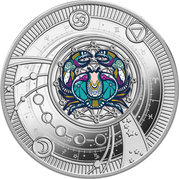 Deze prachtige zilveren munt maakt deel uit van de serie "Zodiac Signs" en is opgedragen aan Kreeft, het symbool van intuïtie, bescherming en diepe emotionaliteit. Dit teken, geregeerd door de Maan, belichaamt gevoeligheid, loyaliteit en een aangeboren zorg voor dierbaren. De munt is geslagen in gepolijste plaat en heeft een gedetailleerd ontwerp en rijke kleuren. Een elegante hangerring maakt het mogelijk om de munt als sieraad te dragen en zo een symbool van innerlijke harmonie en gemoedsrust dicht bij je te houden. De munt wordt geleverd in een etui met een echtheidscertificaat en is wereldwijd gelimiteerd tot slechts 599 stuks.