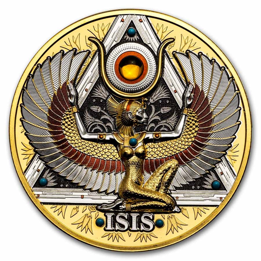 Deze indrukwekkende zilveren munt maakt deel uit van de "Gouden Grootheid" serie en is opgedragen aan de oude Egyptische godin Isis, de godin van het moederschap, magie en bescherming.