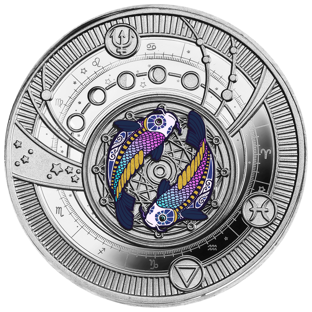 Deze prachtige zilveren munt maakt deel uit van de serie "Zodiac Signs" en is opgedragen aan de Vissen, het mysterieuze en sensuele waterteken waarover Neptunus heerst. De munt belichaamt de diepgaande intuïtie, emotionaliteit en artistieke aard van degenen die onder dit sterrenbeeld geboren zijn. De munt is geslagen in gepolijste plaat, met filigraan details en een helder kleuraccent. Een elegante hangerring maakt het mogelijk de munt als sieraad te dragen en benadrukt de verfijnde stijl en innerlijke harmonie van de eigenaar. De munt wordt geleverd in een etui met een echtheidscertificaat en is strikt gelimiteerd tot slechts 599 stuks wereldwijd.