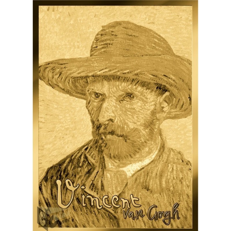 Deze minikaartuitgave eert een van de meest iconische zelfportretten die Van Gogh schilderde tijdens zijn Parijse periode. De achterkant toont een gedetailleerde reproductie van de intense blik van de kunstenaar onder een strooien hoed, en weerspiegelt de expressieve penseelvoering en levendige kleurenleer die zijn stijl definieerden. De munt is geslagen uit 1/1000 troy ounce goud van hoge puurheid, heeft een denominatie van 3000 Francs en is afgewerkt als een proof. De munt heeft een oplage van 50.000 stuks en wordt geleverd in een verzegelde muntkaart met beschermhoes. Het artistieke thema en compacte formaat zorgen voor een aantrekkelijk verzamelobject dat fijne kunst verbindt met vakmanschap in edelmetaal.