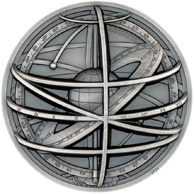 Cookeilanden: verzamelbare zilveren munt Historische instrumenten. Armillosfeer 2024 (ultra-hoog reliëf), 62,2 g puur zilver (0,9999)