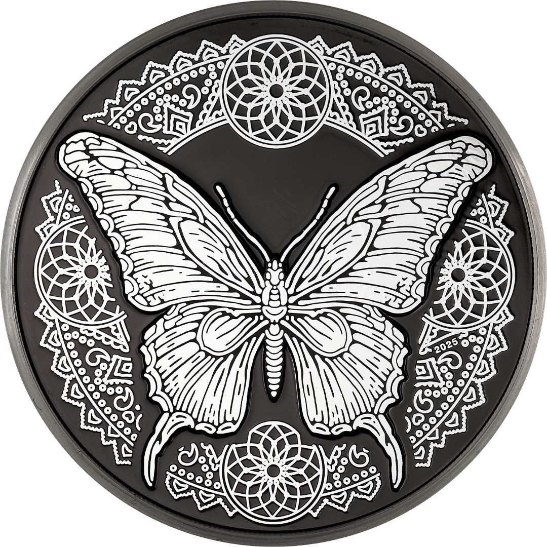 Deze prachtige zilveren munt van 1 ounce is gewijd aan de vlinder, een delicaat symbool van transformatie, vernieuwing en innerlijke harmonie. Het ontwerp is opgebouwd rond een opvallend contrast tussen de lichtgevende vlinder en de diepe Obsidiaanzwarte achtergrond, waardoor elk detail bijna buitenaards lijkt. Het artistieke concept benadrukt het idee van transformatie en de fragiele schoonheid die dit sierlijke schepsel belichaamt. De munt is geslagen in Obsidian Black gepolijste plaat en wordt geleverd in een etui met een echtheidscertificaat. De gelimiteerde oplage is slechts 999 stuks wereldwijd.