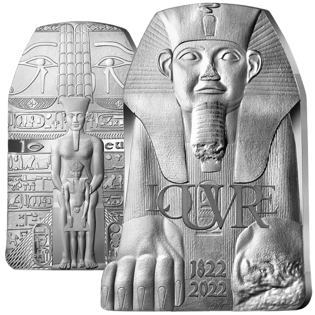 Deze zilveren Proof munt, uitgegeven in 2022 door de Monnaie de Paris in samenwerking met het Louvre Museum, bevat 22,2 g van 0,999 zuiver zilver. De denominatie is 10 euro en de oplage is beperkt tot 5.000 stuks. De munt maakt deel uit van de French Excellence-serie en viert twee historische instellingen aan weerszijden van de Seine. De munt is gewijd aan het thema "Schatten van Egypte" en herdenkt de 200e verjaardag van de ontcijfering van hiërogliefen (1822-2022) en de 100e verjaardag van de ontdekking van het graf van Toetanchamon. De vorm is een reproductie van de Grote Sfinx van Tanis die wordt tentoongesteld in het Louvre. Op de achterkant staat de vergulde bronzen kast van de goddelijke aanbidder Shepenupet, met de god Amun afgebeeld langs de centrale as wakend over de jonge Toetanchamon. Een piramide verschijnt onderaan als symbool van de continuïteit van het erfgoed, naast de cartouches van Toetanchamon. De nominale waarde en RF-initialen staan in het midden, samen met het muntteken.