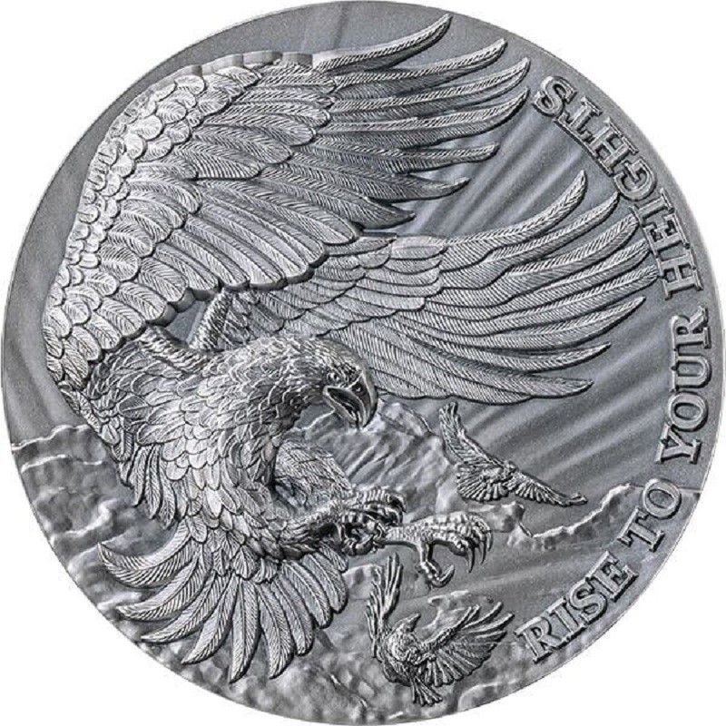 Deze elegante zilveren munt van 2 ounce maakt deel uit van de "Quotes uit het leven" serie en is opgedragen aan de majestueuze adelaar, een symbool van kracht en superioriteit. Op de achterkant staat een adelaar die zweeft boven een raaf, wat staat voor de overwinning van de geest en innerlijke standvastigheid. De munt heeft een antieke afwerking en een hoog reliëf, waardoor de artistieke diepte van het ontwerp wordt benadrukt. De munt wordt geleverd in een elegant etui met een echtheidscertificaat en is gelimiteerd tot slechts 500 exemplaren wereldwijd.