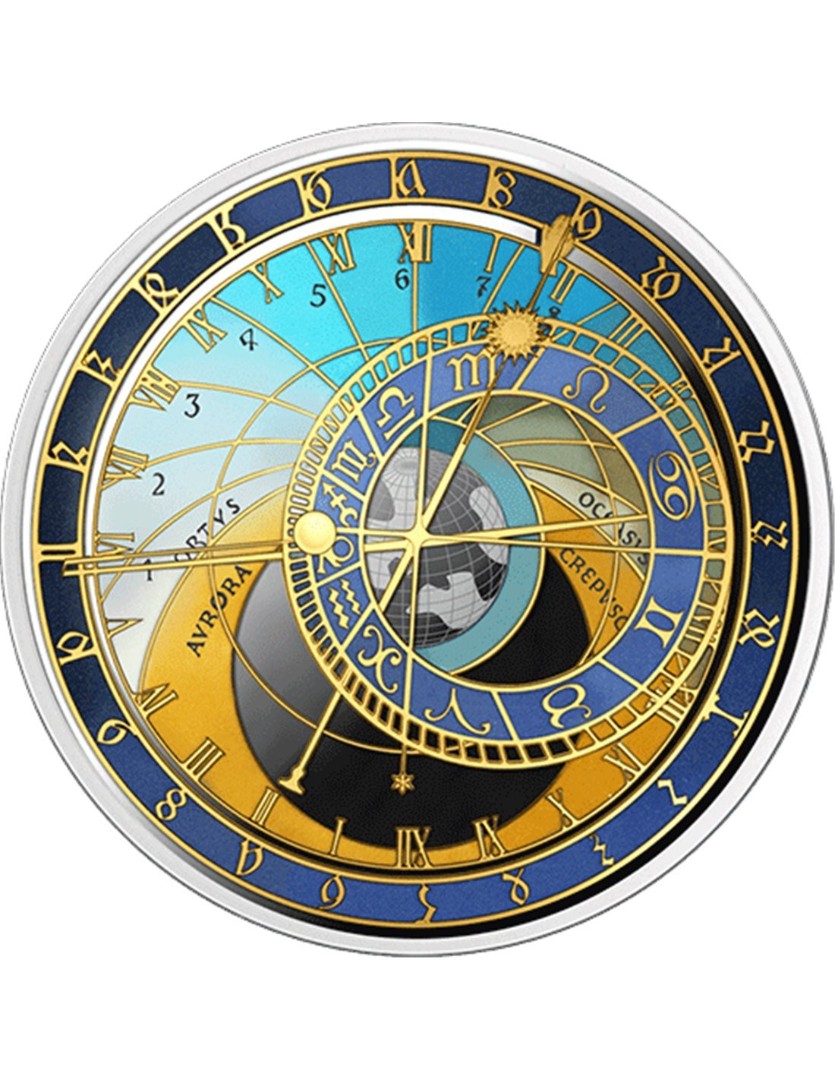 Deze elegante zilveren munt uit Malta markeert de lancering van de nieuwe serie Stadhuisklokken en is gewijd aan de wereldberoemde Astronomische Klok van Praag. De munt is geslagen in gepolijste plaat met verfijnde selectieve kleuren en heeft ook een individueel gegraveerd serienummer op de rand. Het hart van het ontwerp wordt gevormd door de kalenderwijzerplaat van de Orloj, gemaakt door de Tsjechische kunstenaar Josef Mánes, die de cyclus van het leven en het verstrijken van de seizoenen symboliseert. De uitgave wordt gepresenteerd in zijn originele doos en gaat vergezeld van een certificaat van echtheid. De oplage is strikt beperkt tot slechts 700 stuks.