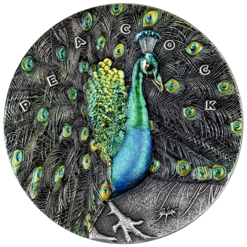 Niue: zilveren verzamelmunt Amazing Animals. Pauw 2022 (gekleurd), 93,3 g puur zilver (0,999)