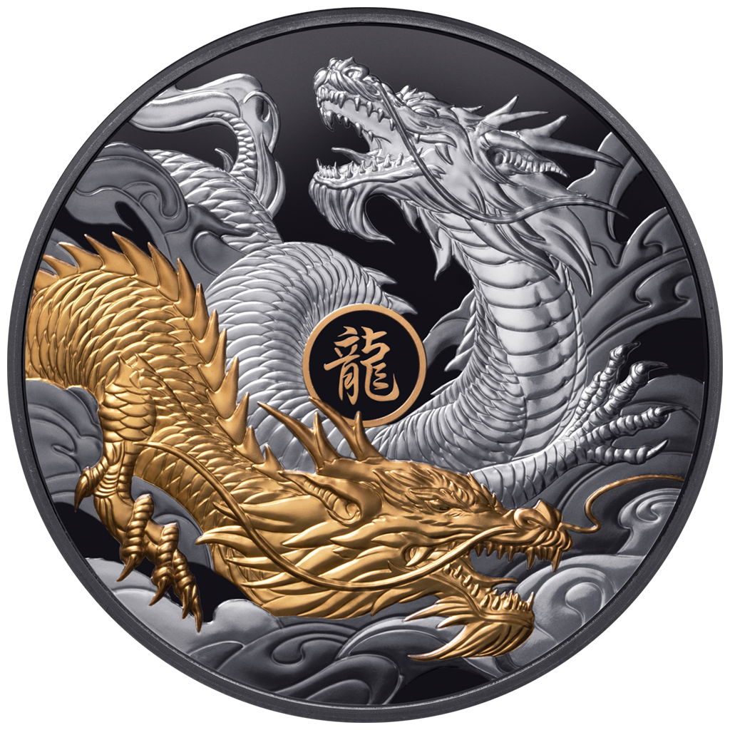 Deze indrukwekkende zilveren munt van 5 ounce is gewijd aan de draak, het vijfde dier van de maankalender. Op de achterkant staan twee in elkaar verstrengelde draken, waarvan er een is geaccentueerd met selectieve vergulding, met in het midden het Chinese karakter voor "Draak". De munt valt op door het verfijnde ontwerp, het expressieve reliëf, de exclusieve gouden accenten en de kenmerkende Black Proof-kwaliteit. De munt wordt gepresenteerd in een houten kist en gaat vergezeld van een echtheidscertificaat. De oplage is wereldwijd beperkt tot 888 stuks.