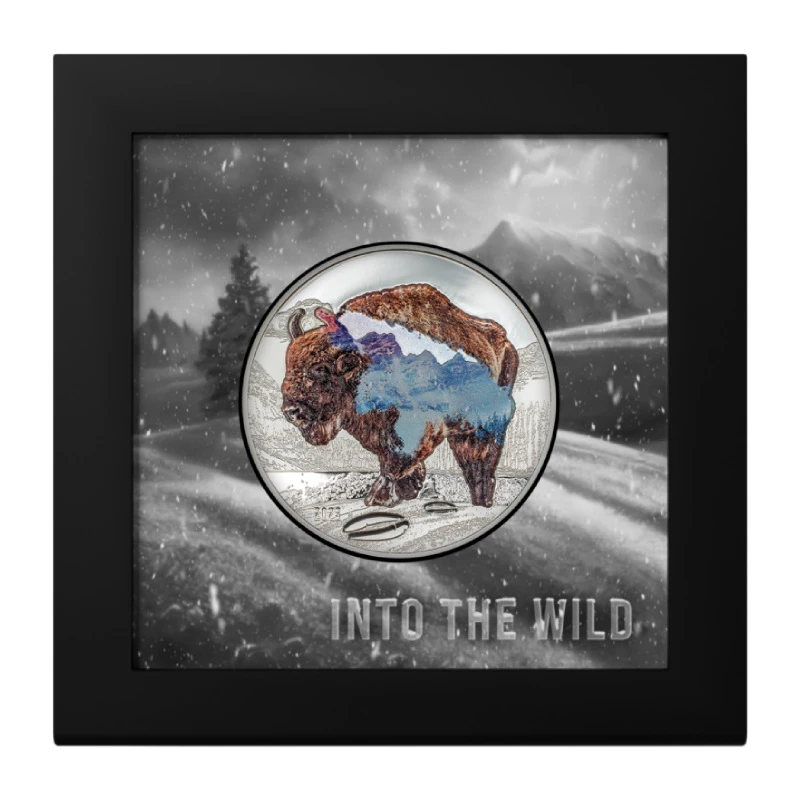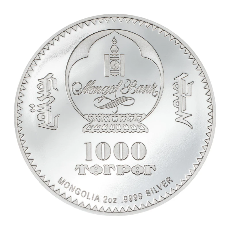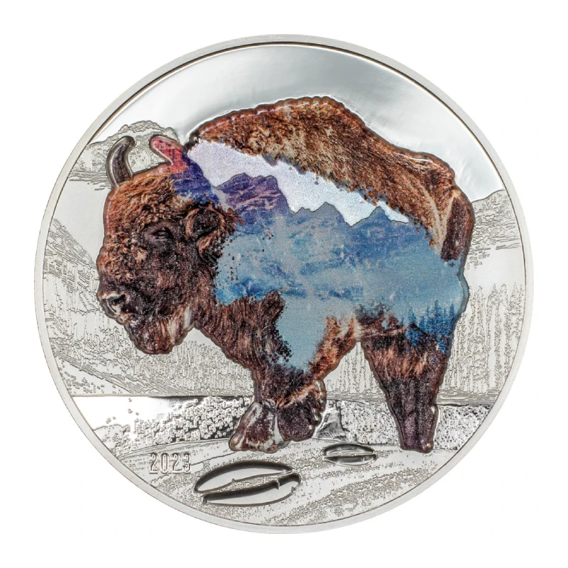 Zilveren munt van Mongolië "Bison" (proof, hoogreliëf, gekleurd) 2023, 62,14 g. puur zilver (0,9999 proof).