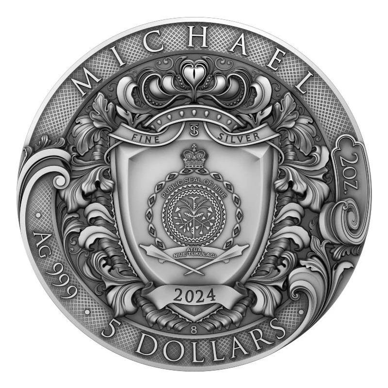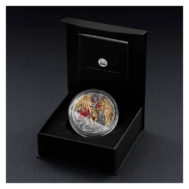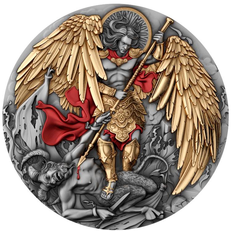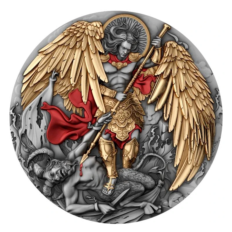 Deze unieke zilveren munt van 2 oz. is gewijd aan de overwinning van gerechtigheid en de bescherming van de mensheid, belichaamd in de beeltenis van de machtige hemelse strijder van het licht, de aartsengel Michael. Met het zwaard van gerechtigheid en rechtvaardigheid symboliseert hij de overwinning van het goede op het kwade. De munt heeft een antieke afwerking, is aangevuld met selectieve vergulding en wordt geleverd in een representatief etui met een echtheidscertificaat. De oplage is strikt gelimiteerd - slechts 500 stuks wereldwijd.