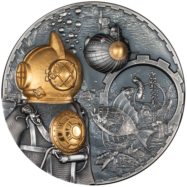 Exclusieve zilveren munt met veel fijne details en zeer hoog reliëf geslagen. Op de munt, in steampunkstijl, staat een veroveraar van de zeebodem afgebeeld, in een gepantserd duikpak, tegen de achtergrond van een vertrekkende onderzeeër en een verscheidenheid aan door de mens gemaakte en mechanische wezens die de zee en de oceaanbodem bewonen.