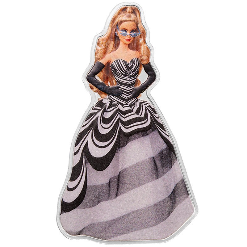 Een verzamelbare zilveren munt van de Salomonseilanden, uitgegeven in 2024 en geslagen uit 1 ounce 0,9999 puur zilver. Deze verfijnde uitgave viert de 65e verjaardag van Barbie en behoort tot de Blue Sapphire serie. De munt heeft de unieke vorm van het silhouet van Barbie en valt op door de levendig gekleurde afwerking en het opvallende ontwerp. De compositie weerspiegelt de iconische stijl van de legendarische pop, met een elegante zwart-witte jurk met een gedurfd patroon en een modieuze zonnebril. Het artistieke concept combineert moderne esthetiek met herkenbare popcultuurbeelden. De munt wordt gepresenteerd in een etui met een echtheidscertificaat. De oplage is strikt beperkt tot 3.000 stuks wereldwijd.