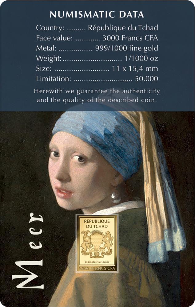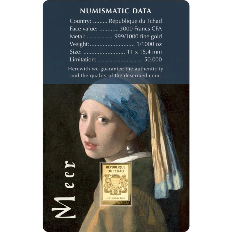Chada gouden munt "Meisje met parel" (proof), 0,031 g. puur goud (0,999 proof)