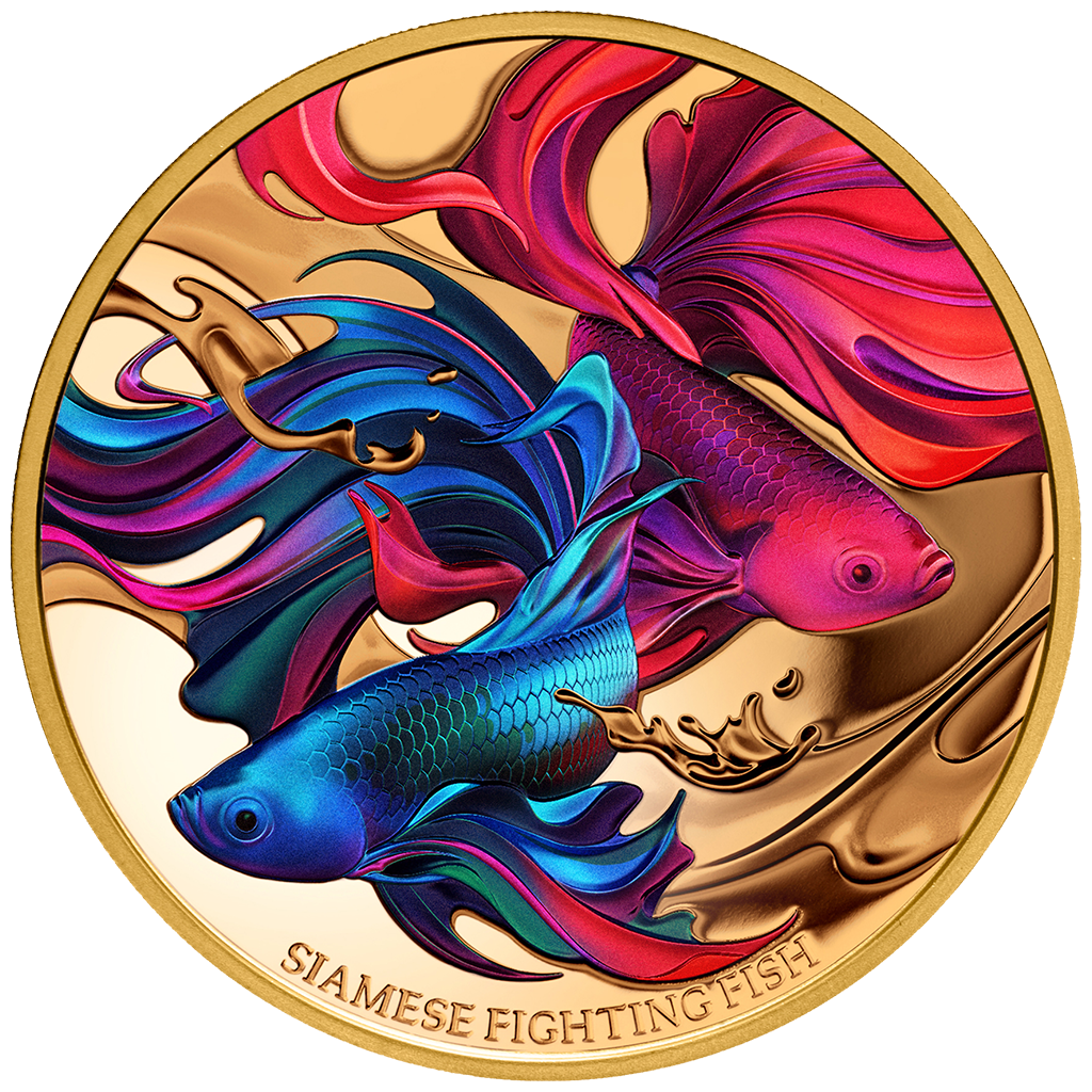 Gouden munt van Niue "Siamese vechtvis" (proof, ingekleurd) 2024g. 31,1g. puur goud (0,9999 proof).