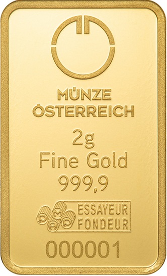 2 gram puur goud (0,9999) in de vorm van een staaf van een van de meest gerenommeerde producenten - de Oostenrijkse Munt. De staaf is geslagen (niet gegoten) en verpakt in een blisterverpakking met certificaat.